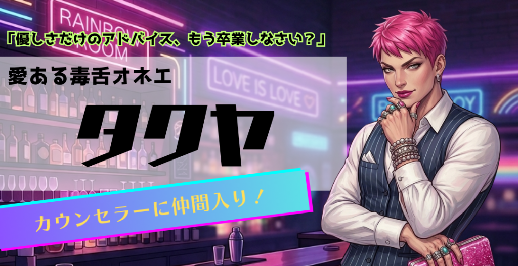 タクヤは、ズバッと本音を言い切る“毒舌オネエ”スタイル。